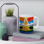 Die Farben der Flagge gehen auf den Moment Buddhas Erleuchtung unter dem Bodhi Baum in Bodh-Gaya zurück.Dort strahlte seine Aura in diesen Farben.