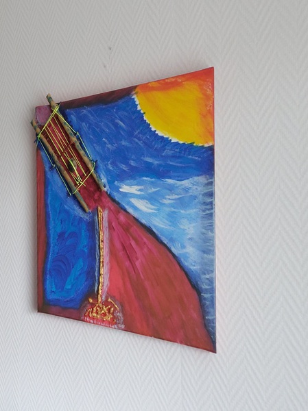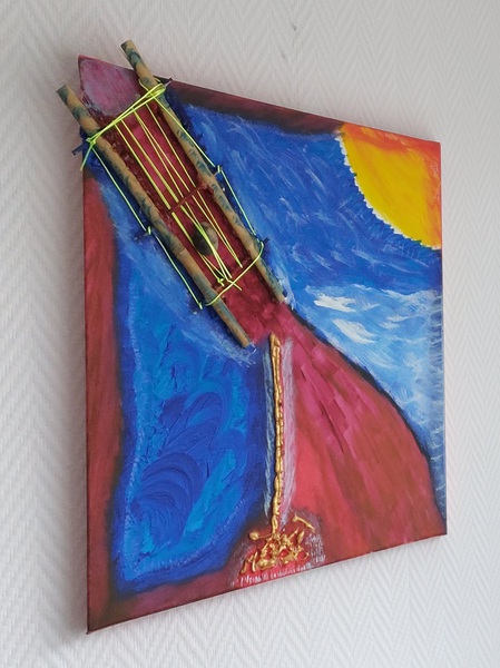 Original / Collage mit Bambus, Energiestein Band und Acrylfarbe auf Leinwand.
