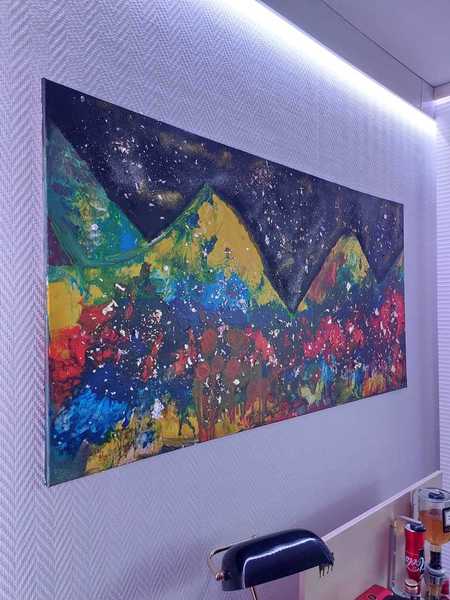 Acrylfarben Gelb, Blau, Rot, Orange, Violett auf Leinwand